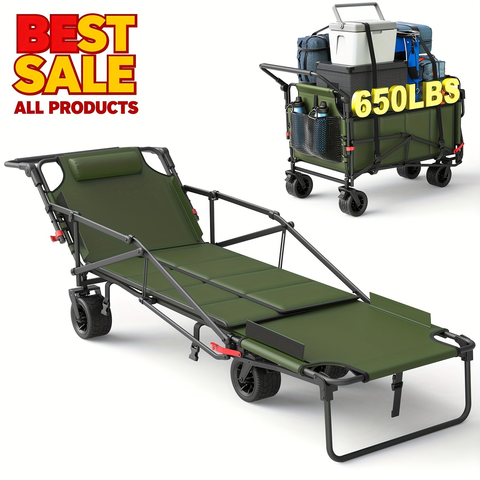 Experience versatile convenience with a two-in-one folding wagon and beach chair that adapts to your day, from grocery runs to sun-soaked beach outings.