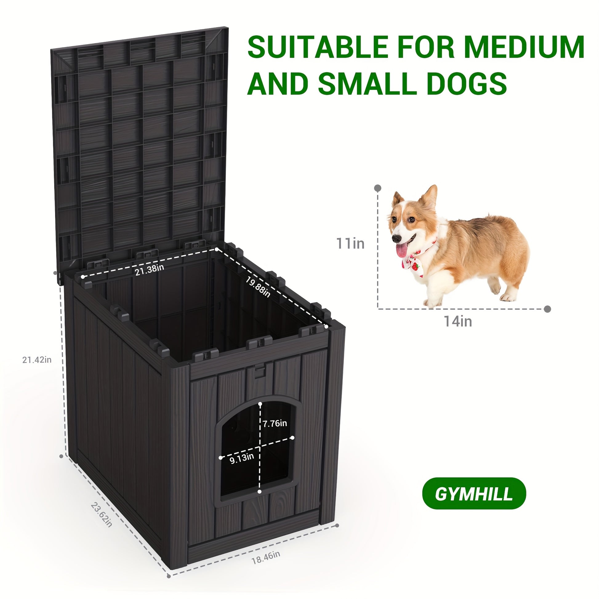 Give your furry friend the ultimate protection with our Weatherproof Resin Outdoor Dog House for Small Dogs. Crafted from durable plastic, this outdoor dog house is designed to withstand the elements, ensuring your pet stays cozy and secure no matter the weather. Measuring at 21.42"x23.62"x18.46", it perfectly accommodates small dogs, offering them a safe haven outside.