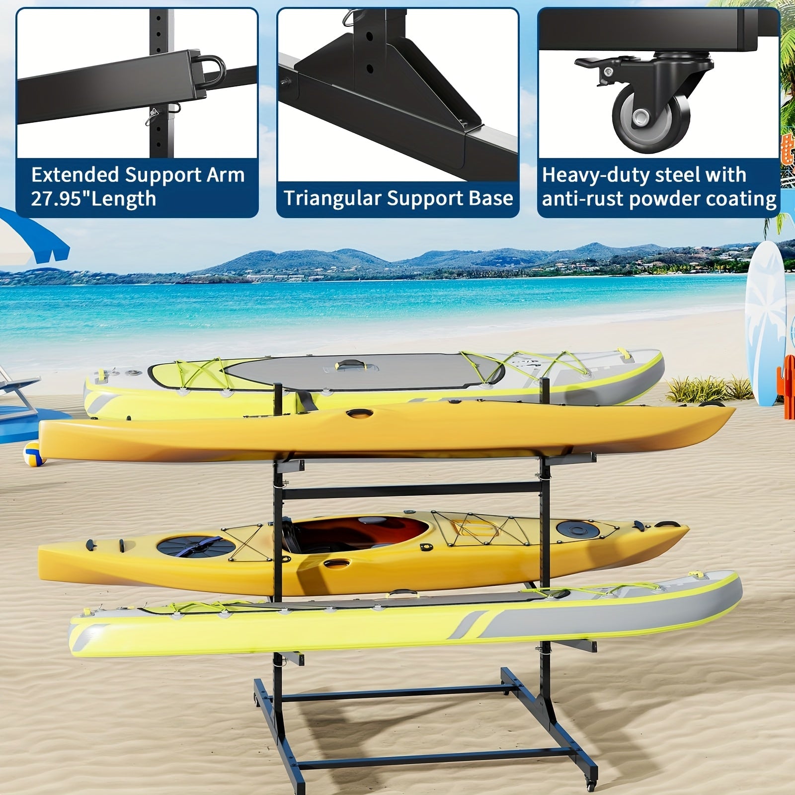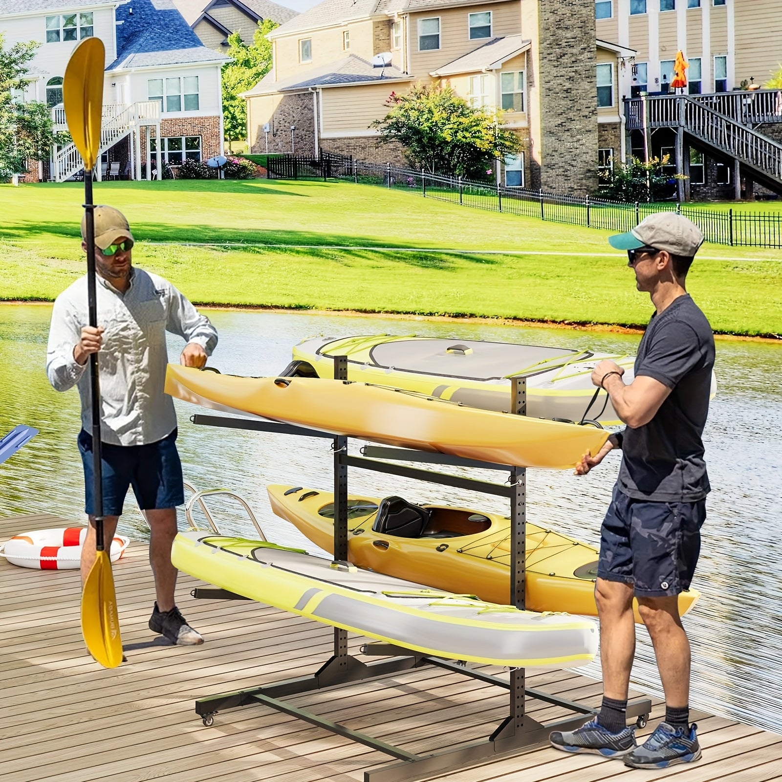 Organize four kayaks with ease using a freestanding rack that rolls on wheels for effortless relocation.