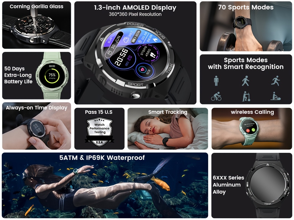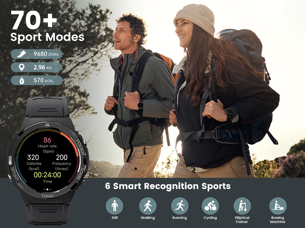 This smart watch is perfect for active lifestyles, featuring 170 sports modes to track a wide array of activities. Whether you're running, cycling, or swimming, the 5ATM water resistance ensures it can handle any environment.